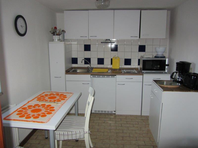 Die Küche ist zweckmäßig eingerichtet mit einem 2-Platten Cerankochfeld, einer großen Kombi-Mikrowelle, die auch zum Backen und Grillen genutzt werden kann. Kaffeemaschine, Toaster, Mixer und Wasserkocher sind vorhanden und ihre Mahlzeiten können sie bequem am Esstisch in der Küche einnehmen.