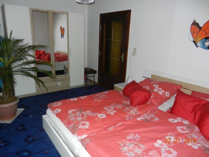 Das ebenfalls große Schlafzimmer beinhaltet ein Doppelbett mit Nachtkonsolen, Radiowecker und einen Spiegelschrank, in dem Sie bequem Ihre Bekleidung unterbringen können.